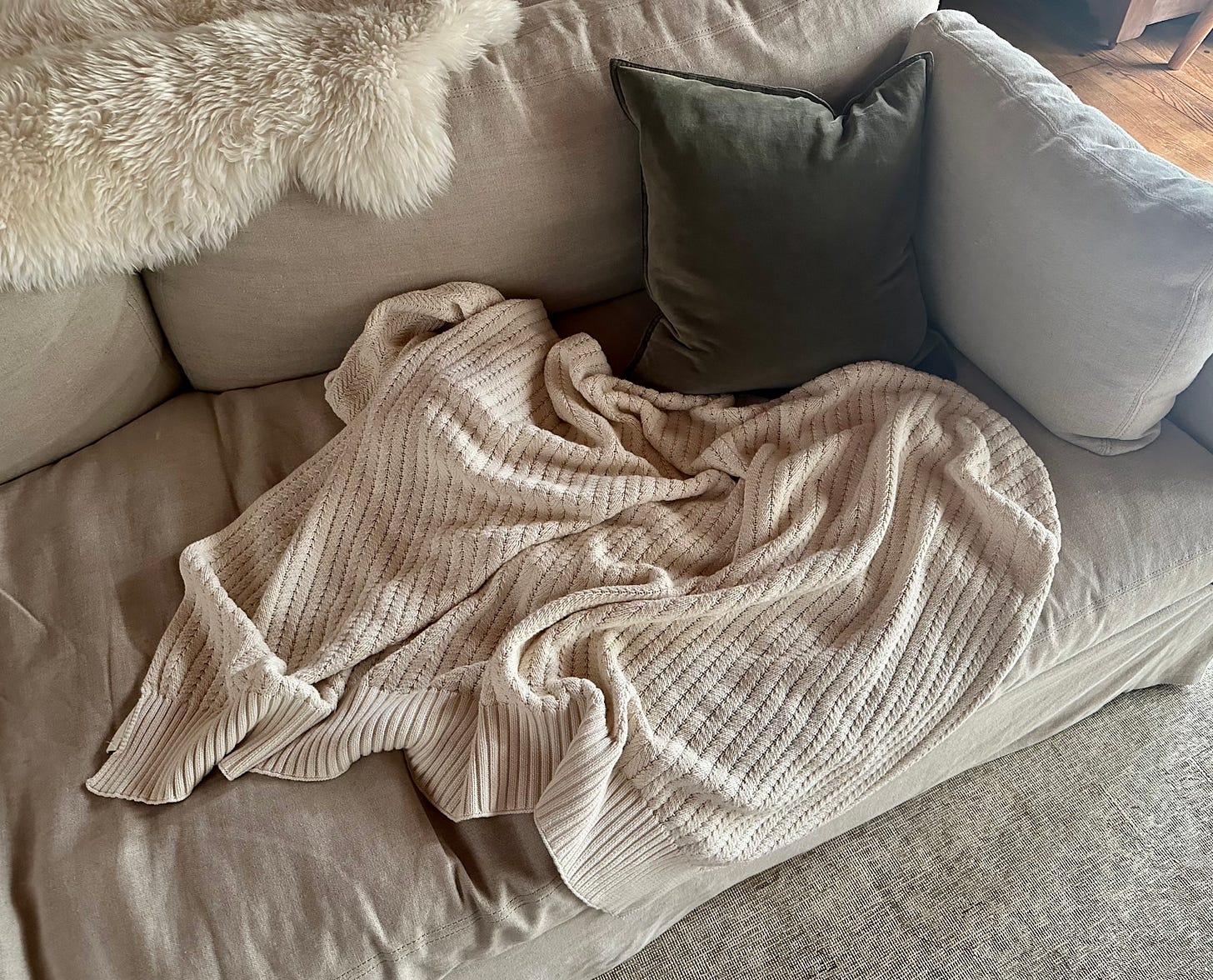 Coyuchi knit throw: Not only does this organic cotton blanket add a nice texture when draped on my couch, but it’s also perfect for lounging (and so warm!). The best part? Ollie always reaches for it when we read together.