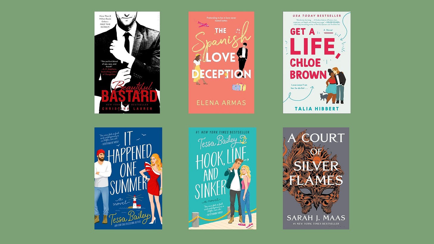 If you’re new to smut romance and want to try one out, I vote starting with Christina Lauren’s Beautiful Bastard series (a 5/5 series for me), Elena Armas’s The Spanish Love Deception, Tessa Bailey’s It Happened One Summer (and the second in the series, Hook, Line, and Sinker), and Talia Hibbert’s Get a Life, Chloe Brown (and the two others in the series). Sarah J. Maas’s A Court of Silver Flames is my favorite of all, but you need to read the other books in the ACOTAR series before that one.