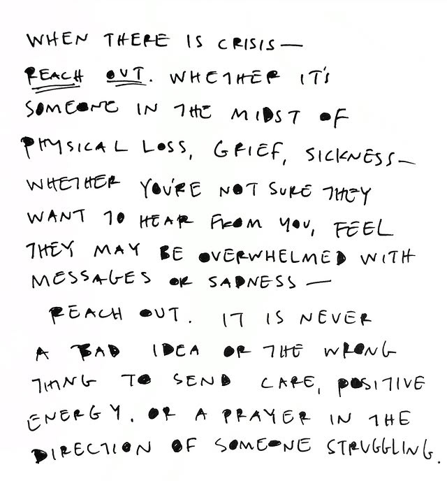 To me, any sort of acknowledgment of the loss, something as simple as “I’m thinking of you and I love you,” is a comfort. Letting someone know that you’re here for them will only alleviate the heaviness. Saying nothing at all, whether you don’t know what to say or you’re scared to say the wrong thing or you’re worried you might drudge up bad feelings if you mention it, is actually not helpful. I repeat: do not do this! I can’t tell you how often this happened after Rowe, so if I have one piece of advice, it’s reach out to your people, even if it’s “I don’t know what to say, but I’m sorry and I’m here for you.”