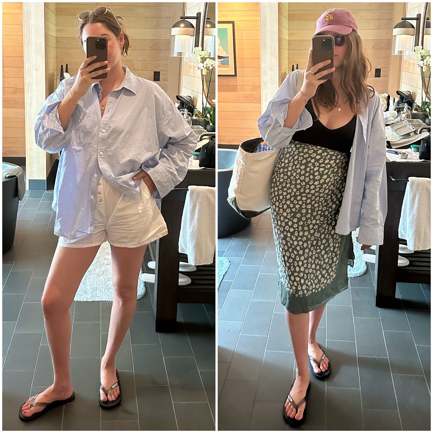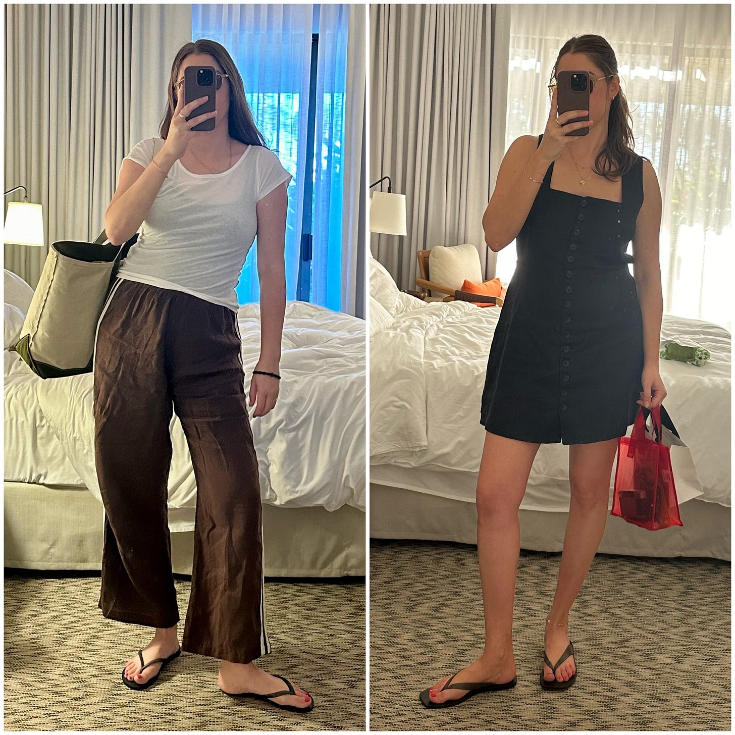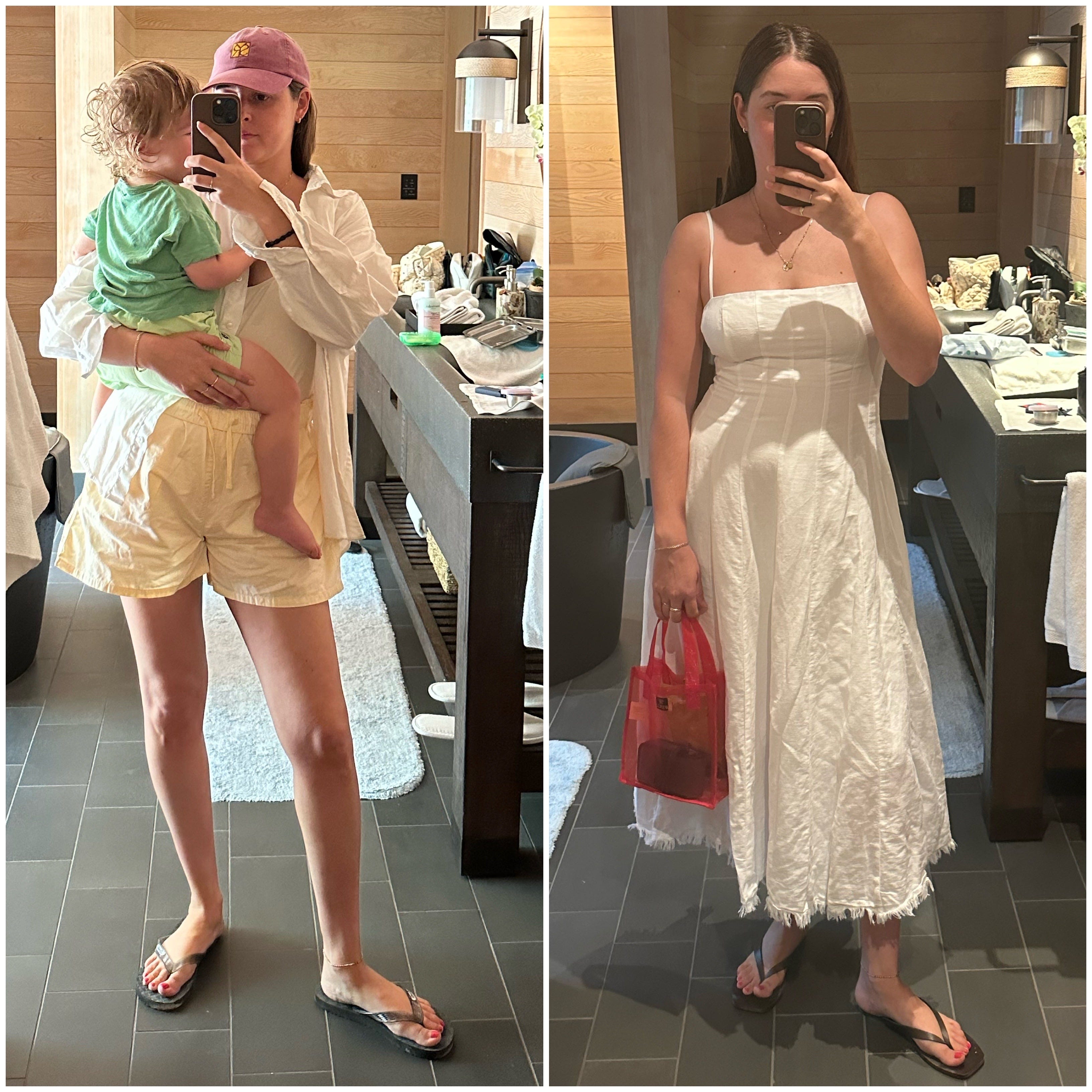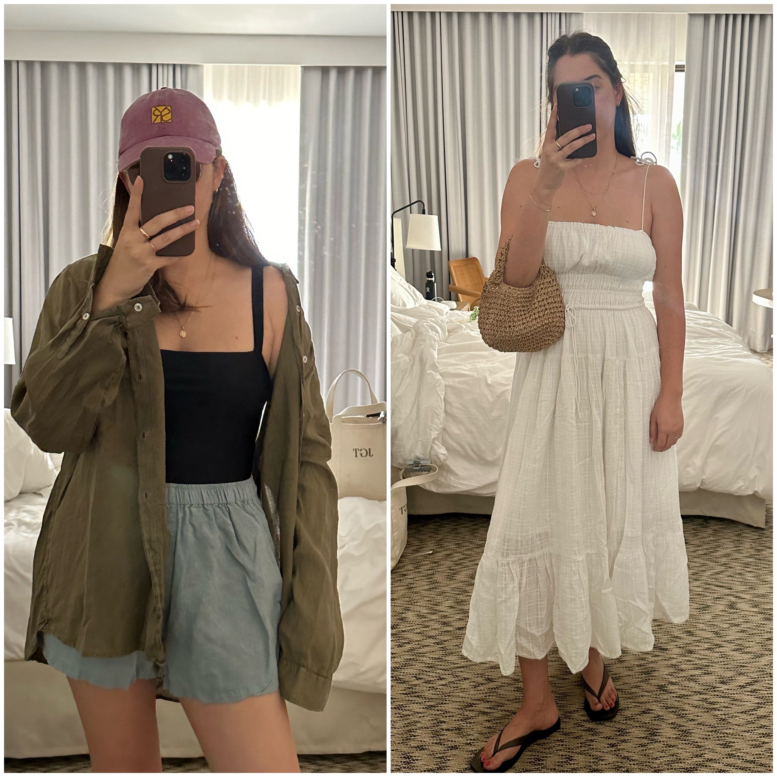 For this particular trip, which revolved around our toddler, we planned to spend our days by the pool and beach, so I packed simple swim-adjacent items for daytime—oversized shirts, pull-on shorts, pareos, linen separates, and flip flops. For evenings, I love dressing up for dinners, so I brought lots of fun summer dresses and skirts, all paired with easy sandals (these A. Emery leather flip flops are a real hero for me).