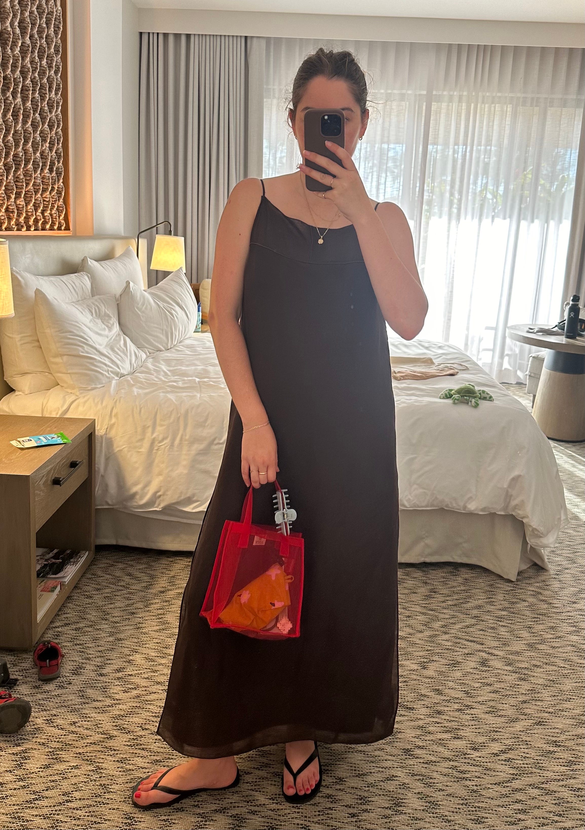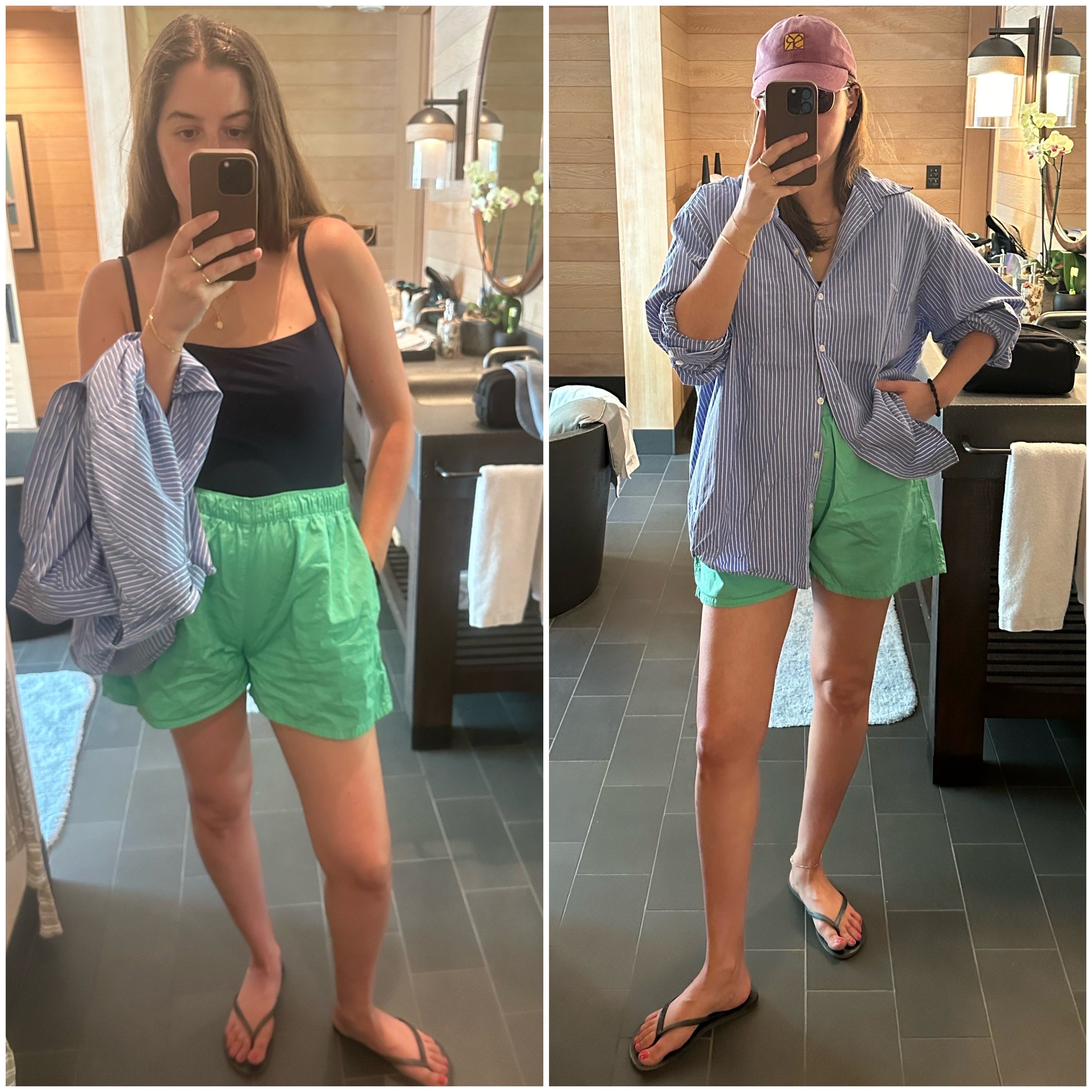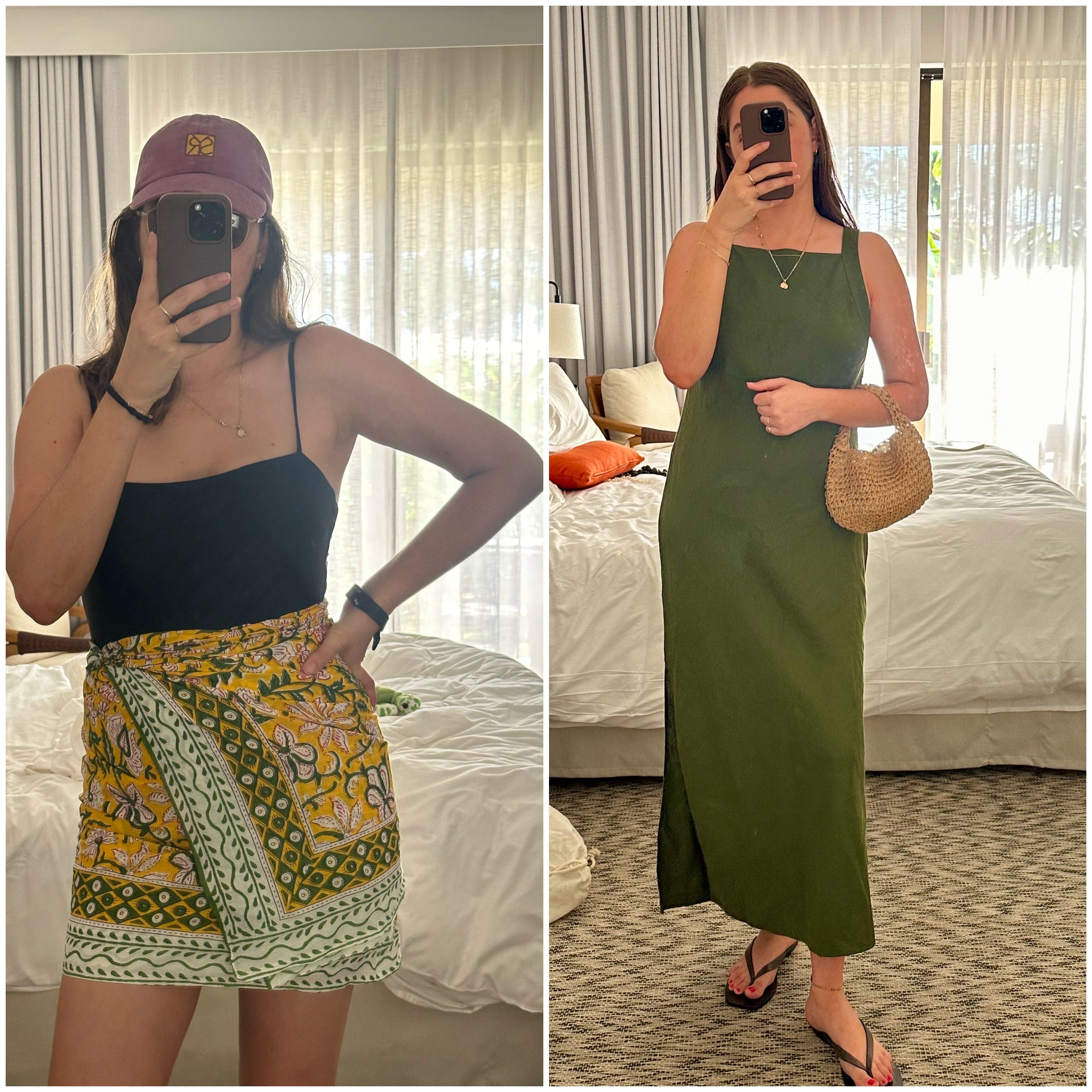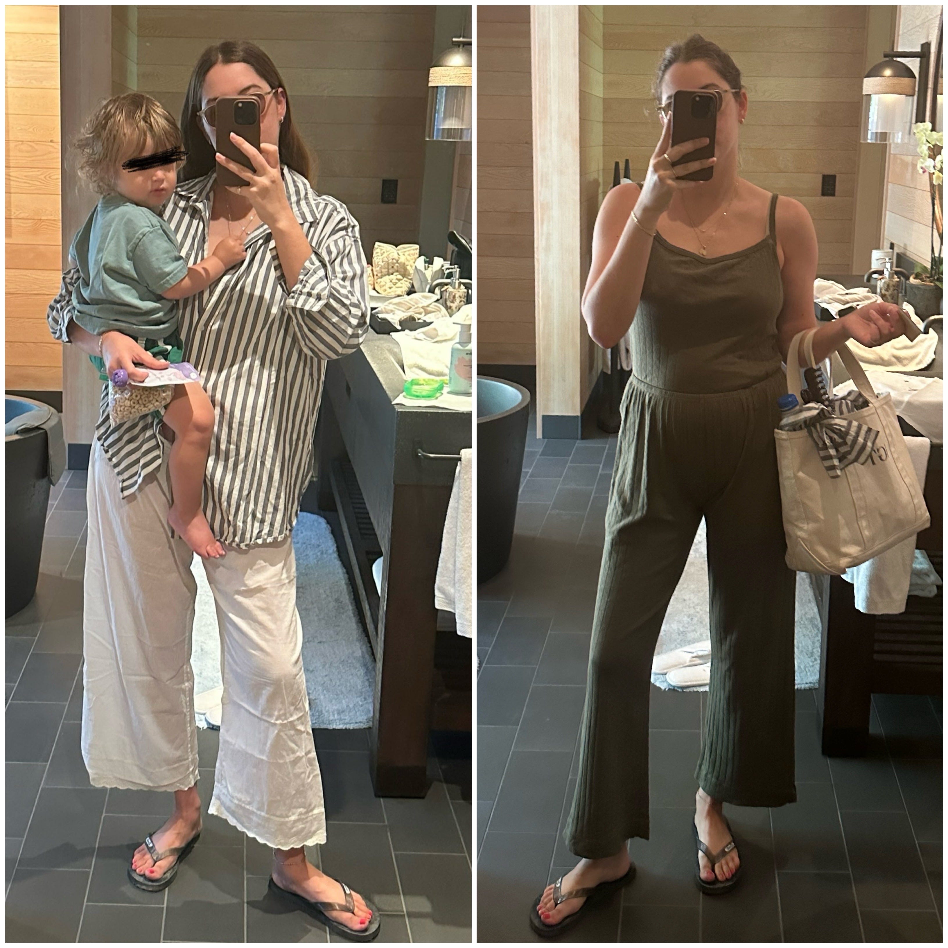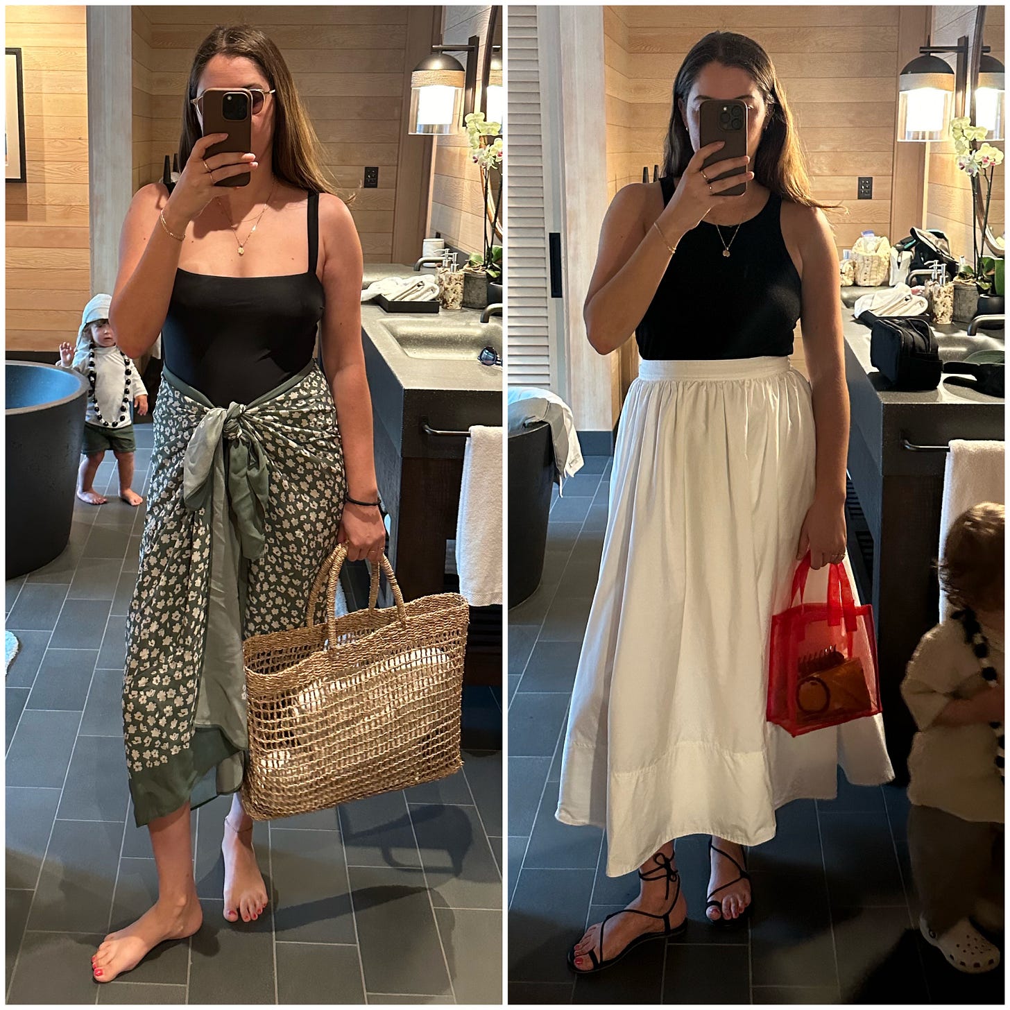 For this particular trip, which revolved around our toddler, we planned to spend our days by the pool and beach, so I packed simple swim-adjacent items for daytime—oversized shirts, pull-on shorts, pareos, linen separates, and flip flops. For evenings, I love dressing up for dinners, so I brought lots of fun summer dresses and skirts, all paired with easy sandals (these A. Emery leather flip flops are a real hero for me).